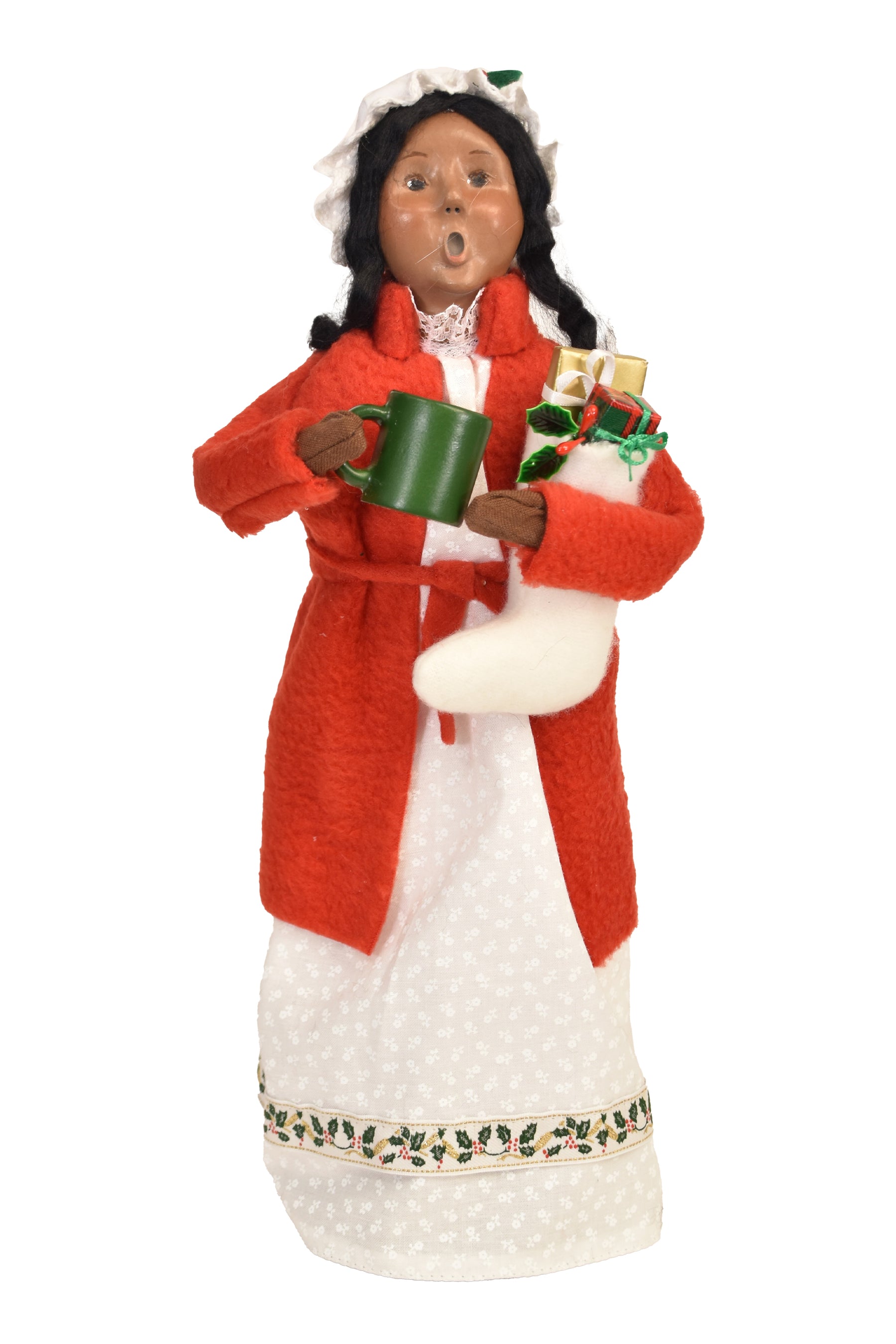 This handcrafted Byers’ Choice Stocking Family Woman Caroler is festive and perfect for the Christmas holiday season. As a mother enjoying a peaceful morning coffee, she embodies the joy and comfort of holiday traditions in your "Christmas decorations."