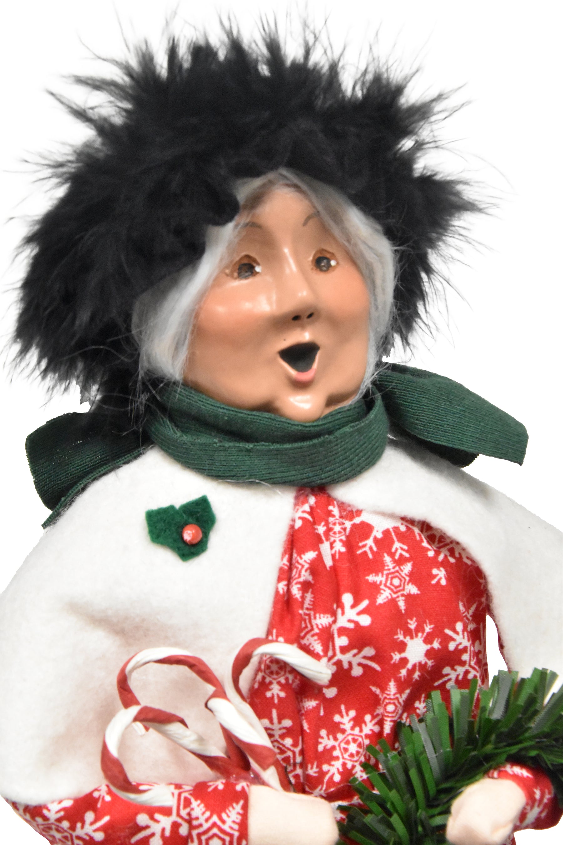 This handcrafted Byers’ Choice Winter Wonder Mrs. Claus is a One-of-a-Kind Joyce Original. Dressed in luxurious holiday fabrics and adorned with charming seasonal accessories, she brings the warmth and spirit of Christmas to life. Each OOAK Mrs. Claus is individually styled by Joyce Byers, making her a truly special addition to any collection.