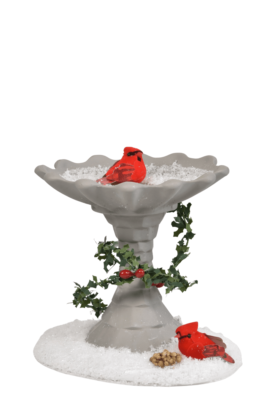 This Byers Choice Bird Bath Display Accessory is a charming addition to any holiday display, especially for bird lovers. Featuring a bright red cardinals perched atop, this seasonal accent adds a touch of warmth and nature to your Christmas decorations. It pairs beautifully with our Cardinal Family or Cardinal Santa figures to create a festive, nature-inspired scene.