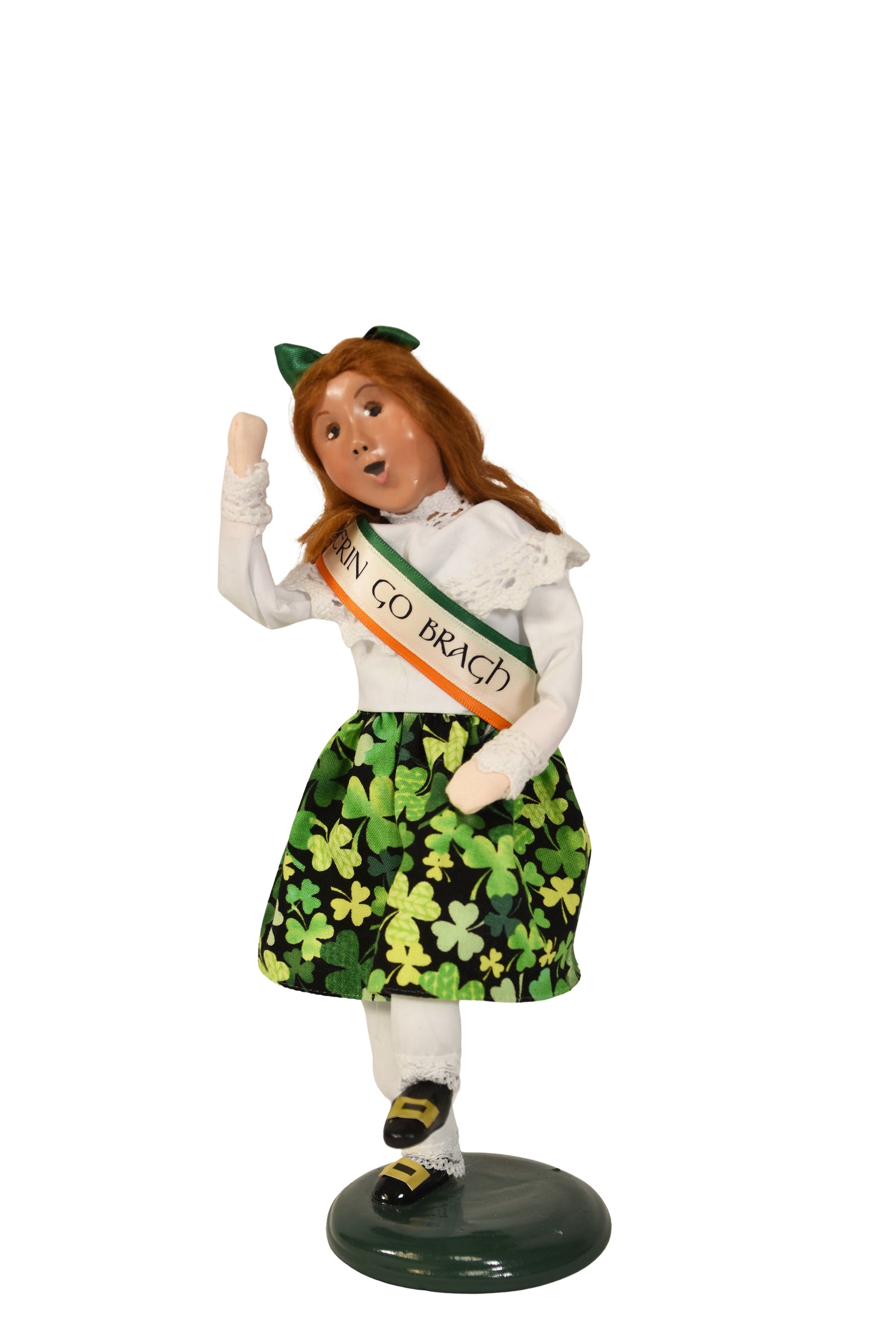 This handcrafted Byers’ Choice Irish Lass Dancing Caroler is festive and perfect for celebrating Irish heritage, seasonal traditions and St Patrick's Day decorating. Caught mid–Irish jig with one foot lifted high, she brings joyful movement and spirited charm to St. Patrick’s Day displays and cultural collections alike.