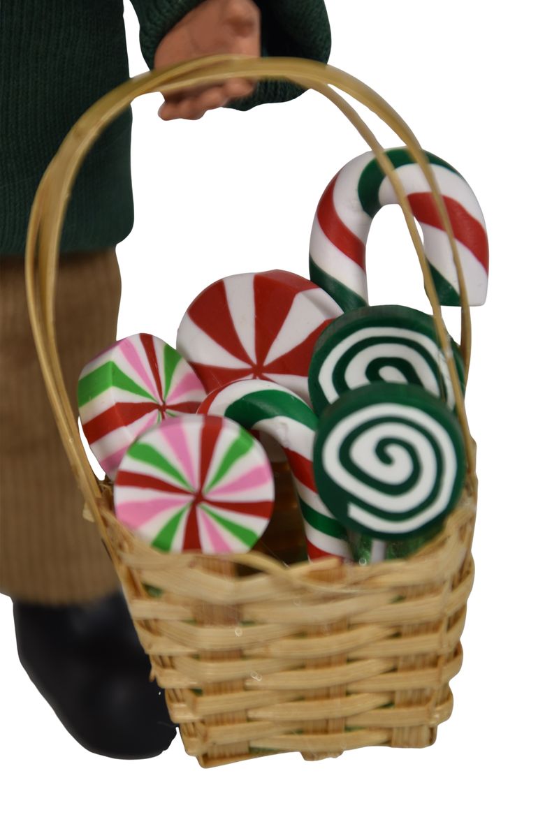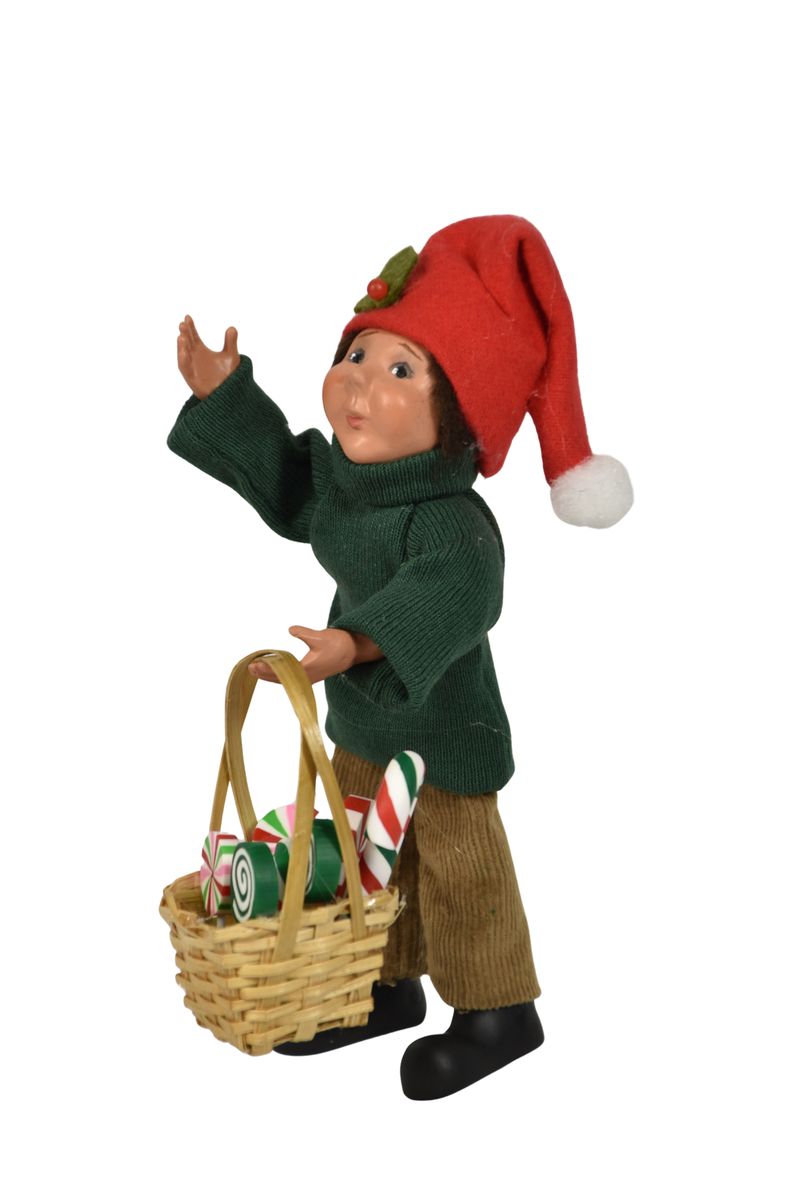 This handcrafted Byers’ Choice Sweets Toddler Boy Caroler is festive and perfect for the Christmas holiday season. Wearing matching a cozy green sweater and red Santa hat, he clutches a basket brimming with Christmas candy and reaches his hand up for a second helping!