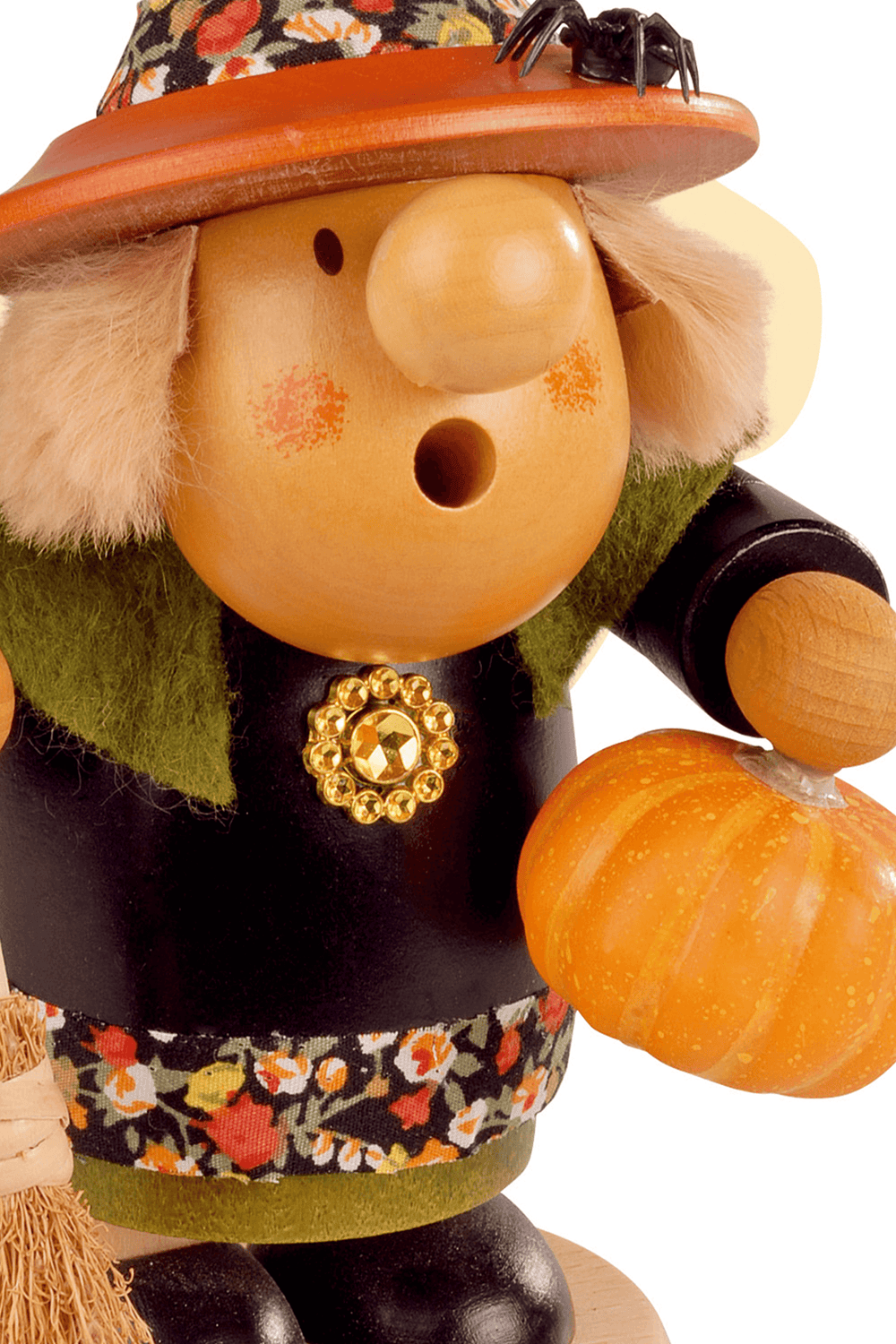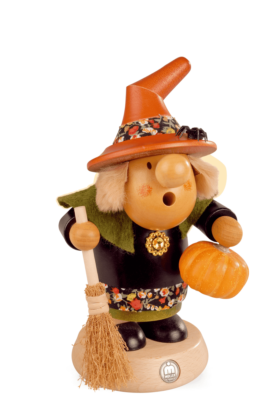 This German handcrafted Mueller Witch with Pumpkin Smoker adds a delightful twist of spooky charm to your Halloween decorations. Dressed in a classic witch’s cloak and hat, she holds a festive jack-o'-lantern, ready to stir up Halloween cheer. When a lit incense cone is placed inside, gentle wisps of smoke curl from her mouth, creating a hauntingly fun atmosphere perfect for Halloween lovers and collectors alike.