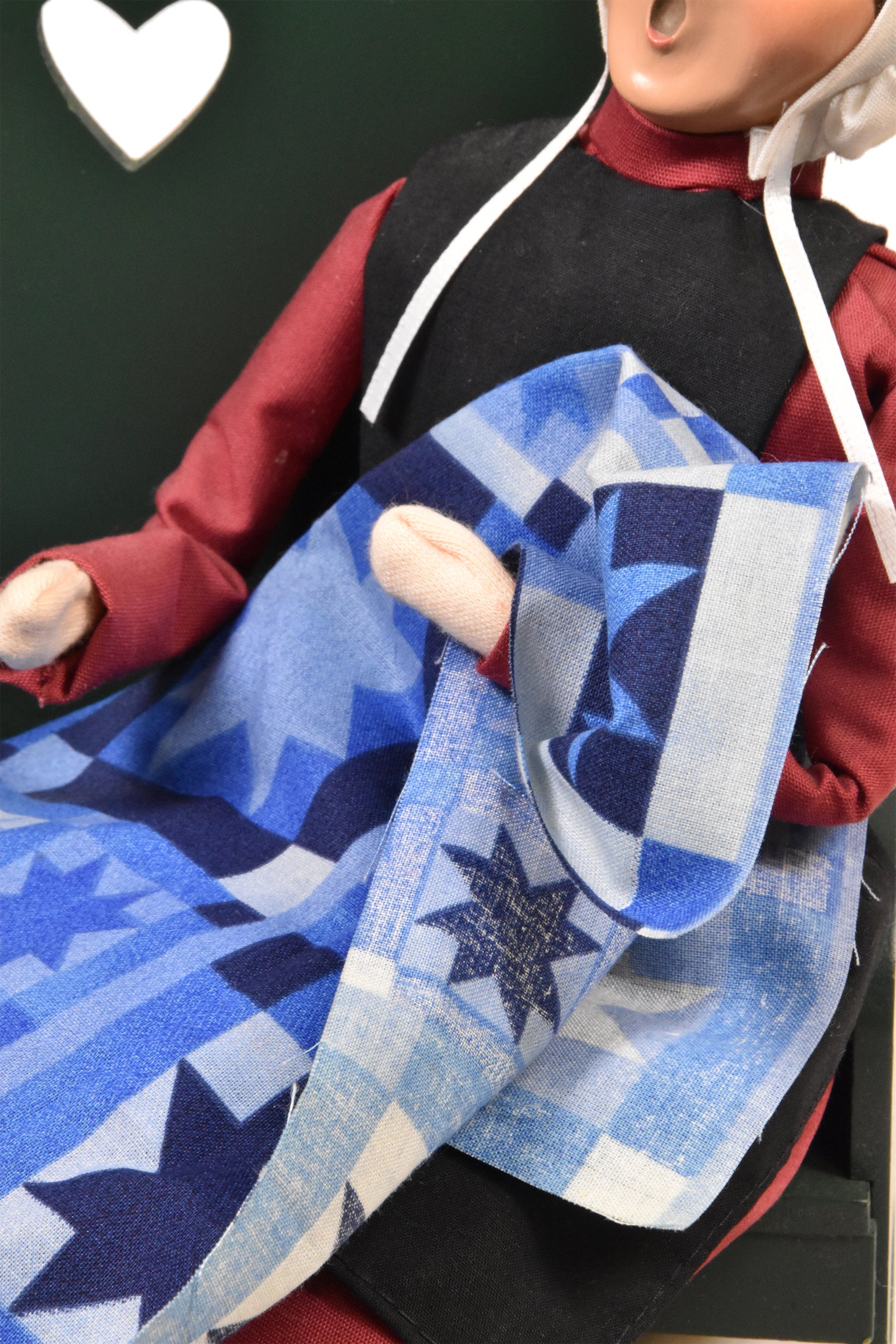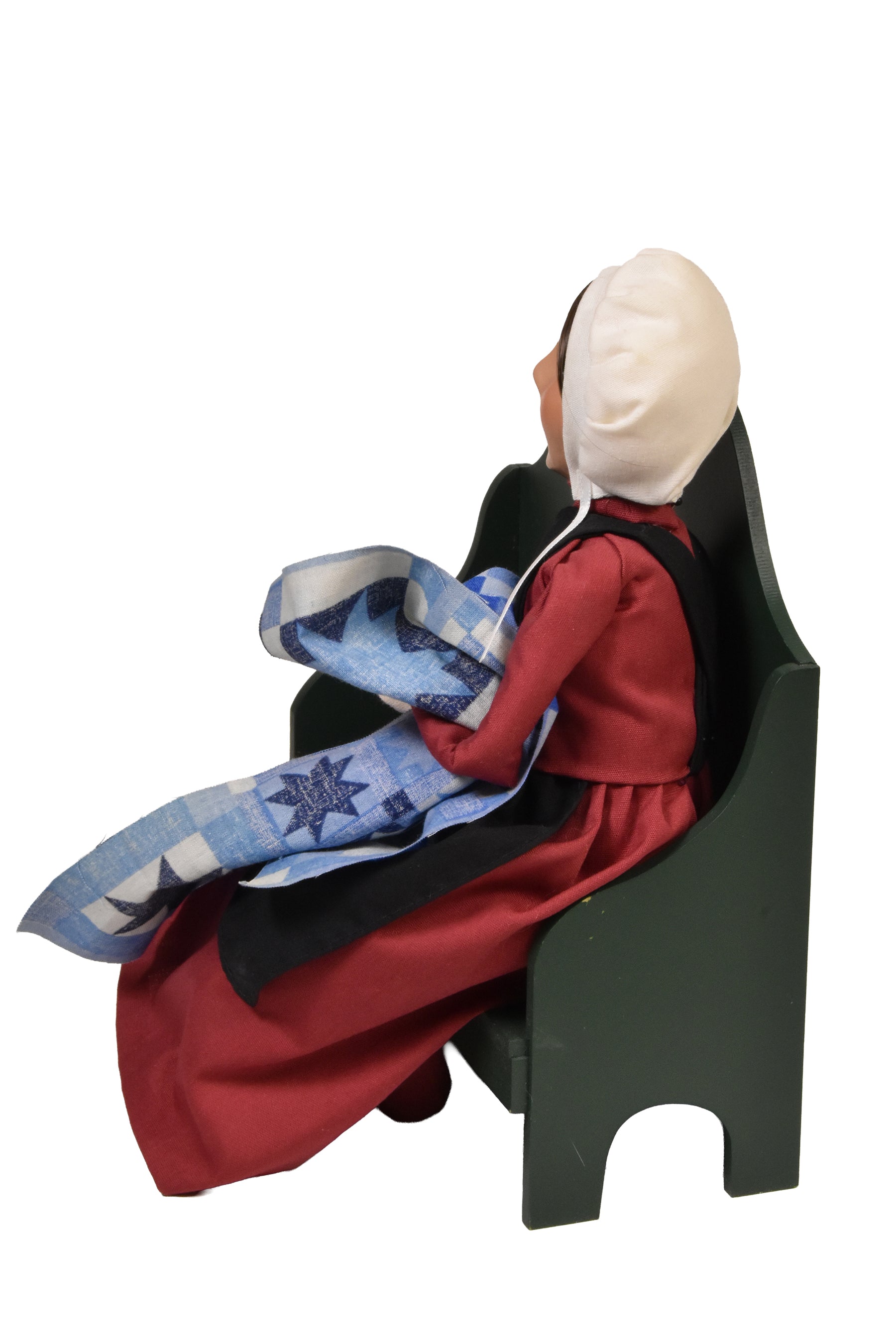 Quilting has long been a cherished tradition in Amish communities, symbolizing patience, skill, and the passing down of handmade artistry through generations. This figure reflects that enduring legacy, evoking warmth, simplicity, and the beauty of creating something meaningful by hand.